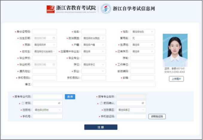 2.在注册页面填写基本信息并上传照片,标注“*”的为必填项。填写完成后,点击注册页面下方“注册”按钮完成注册。考生须牢记自己设定的密码。“手机号码”必须填写考生本人惯常使用的手机号。